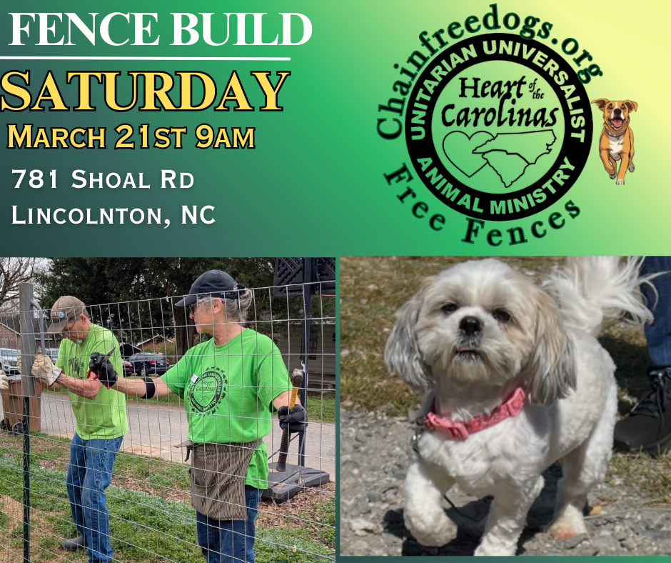 At Heart of the Carolinas Unitarian Universalist Animal Ministry, we are dedicated to giving dogs the freedom and safety they deserve. Our volunteers come together to build fences that create secure, happy spaces for dogs who have spent too long on chains. Each fence we build is a chance for a dog to run, play, and experience life the way every dog should.